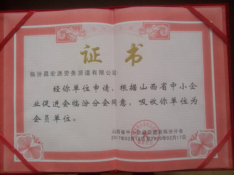 熱烈祝賀!臨汾昌宏源勞務(wù)派遣有限公司獲得山西省中小型企業(yè)促進(jìn)會(huì)臨汾分會(huì)授予的會(huì)員單位的稱(chēng)號(hào)