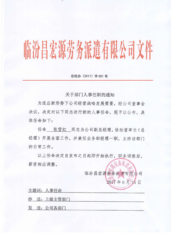 為適應新形勢下公司經(jīng)營戰(zhàn)略發(fā)展需要,經(jīng)公司董事會決議,決定對以下同志進行新的人事任命,現(xiàn)予以公布,具體任命文件如下: